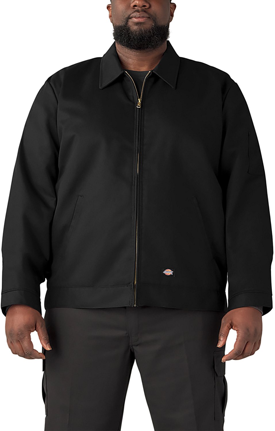 The Dickies Men's Insulated Twill Eisenhower Jacket is made of 65% polyester and 35% cotton vat-dyed twill with a nylon taffeta lining quilted to polyurethane foam for warmth. Slash front pockets and a pencil pocket on the left sleeve. Adjustable tabs at the waistband. Heavy-duty brass zipper closure.