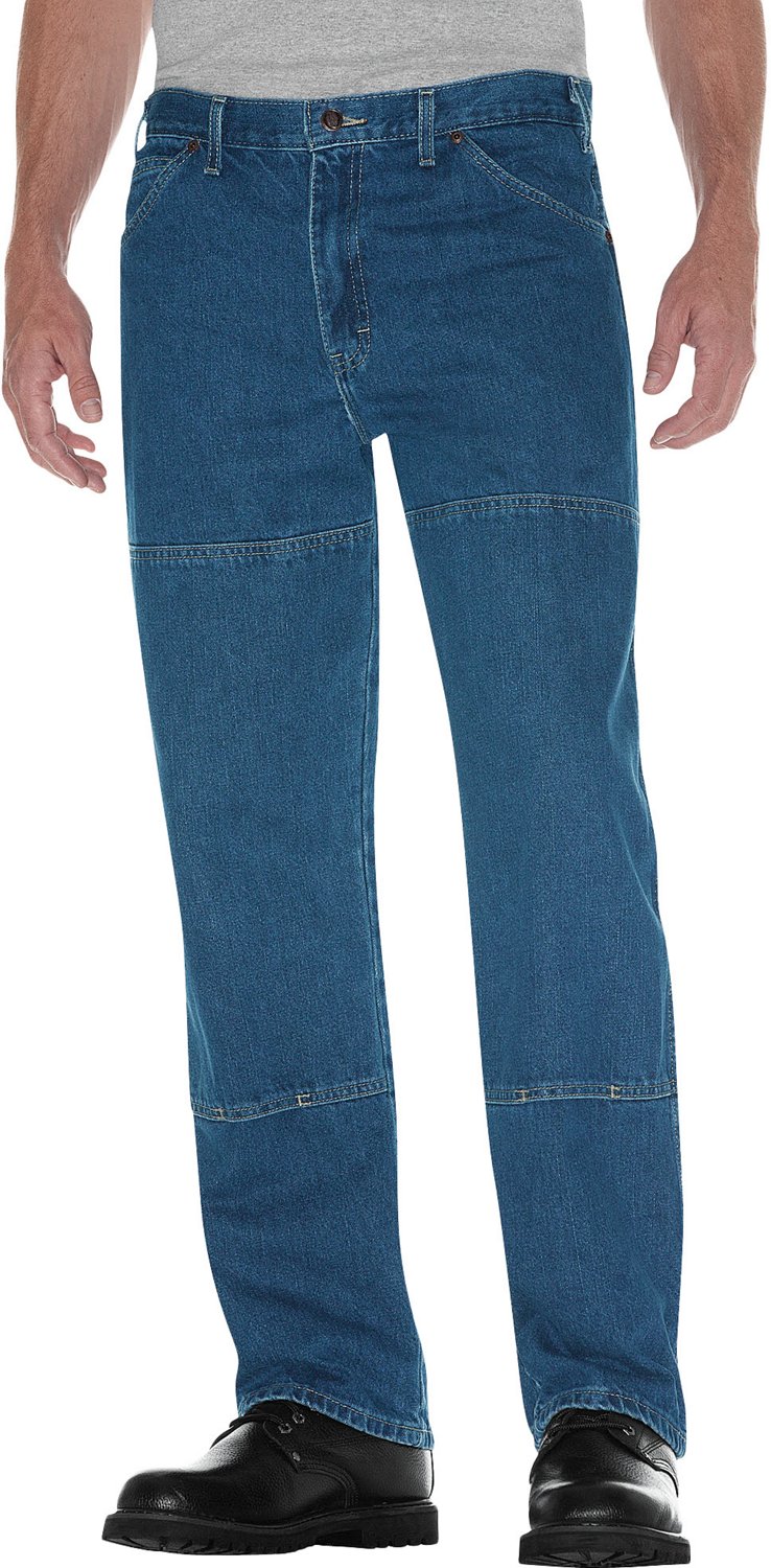 The Dickies Men's Relaxed Fit Stone Washed Workhorse Jean is made of heavy-duty, 100% cotton denim and features double-reinforced knees and rivets at all stress points for rugged performance. This jean offers a multiuse side pocket and is designed to fit over boots. Button closure with a brass zipper fly. Relaxed fit through the seat and thigh.