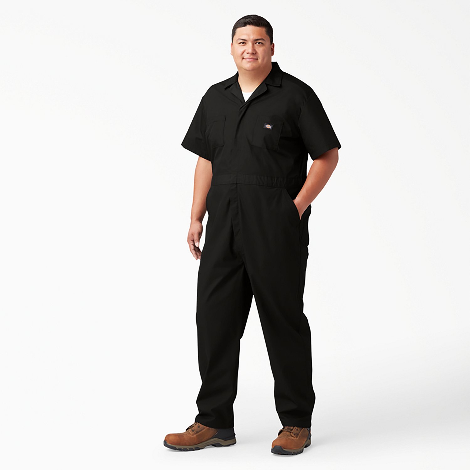 Keep your clothes protected while on the jobsite in the Dickies Men's Short Sleeve Coverall. Made of 65% polyester and 35% cotton poplin for comfortable wear, this coverall features stain-release fabric technology for easy cleaning and a front zipper closure with concealed snaps at the waist and neck. The bi-swing back and roomy shoulders allow ease of movement. 5-pocket design.