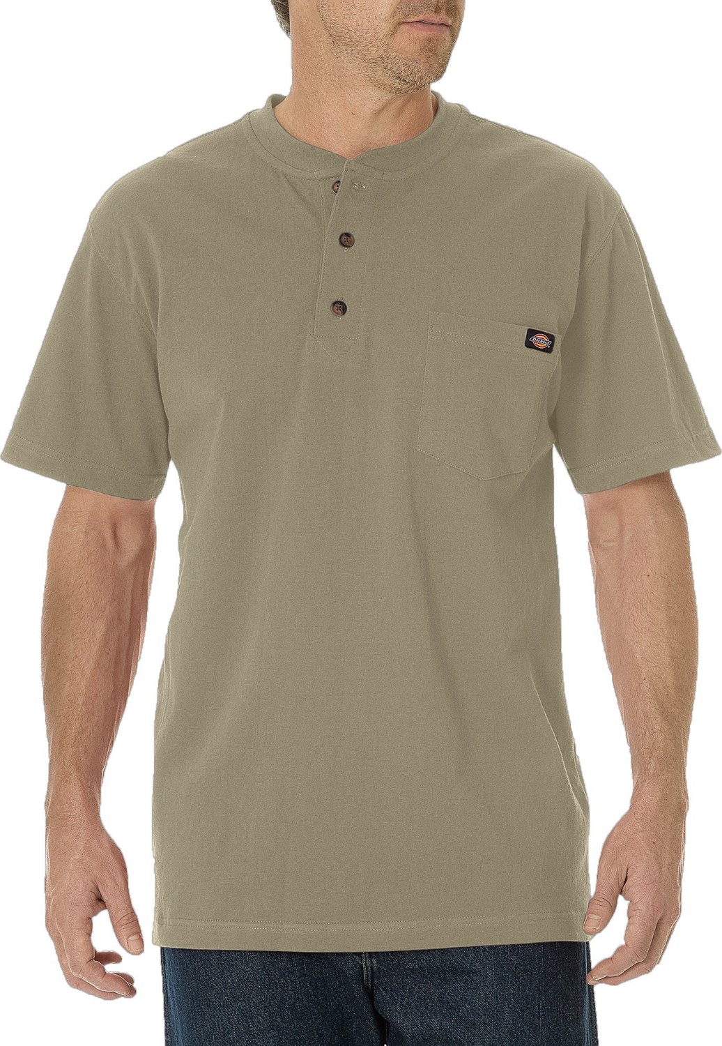 The Dickies Men's Short Sleeve Heavyweight Henley is made of 100% cotton jersey knit to provide a soft feel and comfortable wear. This henley features taped neck and shoulder seams for added strength, and it has 3 logo horn buttons in the front. Left chest pocket. Tagless collar.