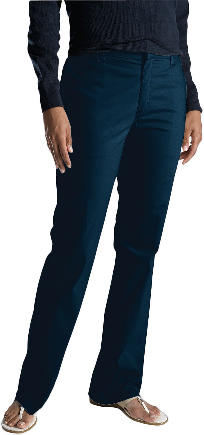 Great for work or for casual wear, the Dickies Women's Slim Fit Boot Cut Stretch Twill Pant is made of 97% cotton and 3% spandex stretch twill for comfortable wear and features a contoured waistband with stretch interlining that helps prevent gapping in the back. Sits slightly below the waist. Boot-cut. Hook-and-eye closure offers a smooth front look.