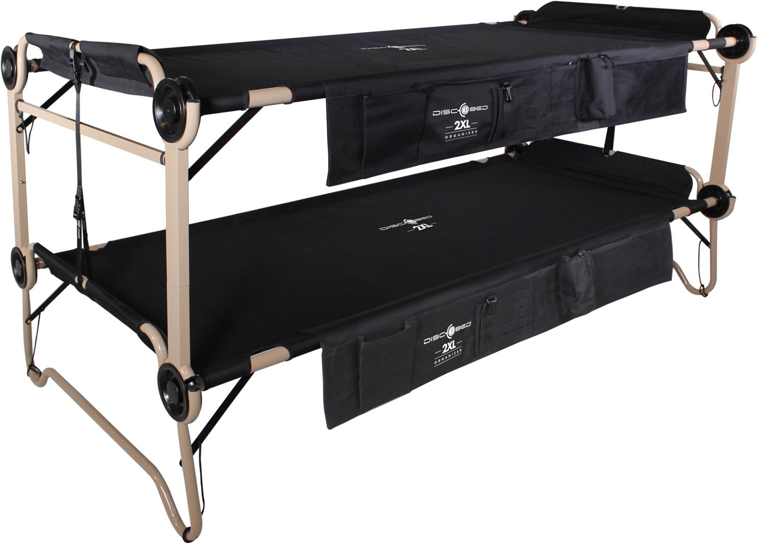 Equip your campgrounds with comfort with the Disc-O-Bed 2XL with Organizers Cot System. This cot system features a powder-coated, anti-rust steel frame and PVC-coated 1200D polyester fabric for a durable use that can support up to 600 pounds. The stack adapters and locking straps allow you to bunk it, bench it or turn it into two cots, while the organizers allow for easy access to your gear.
