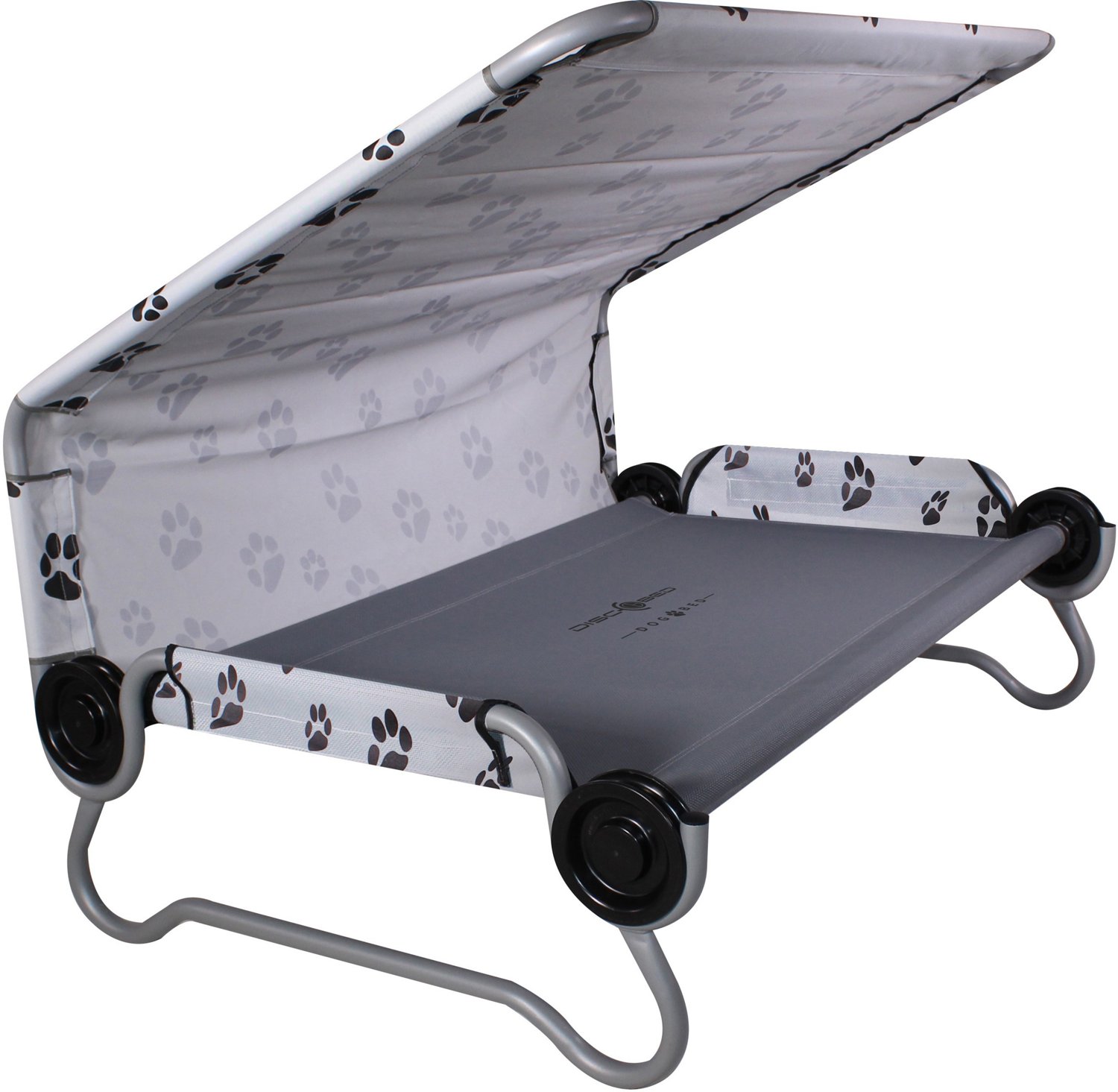 Keep your furry pal comfortable on the go with help from the Disc-O-Bed Elevated Canopy Dog Bed. The Texteline mat provides cooling, breathable comfort and the included canopy offers sun protection. The elevated construction helps keep your pet off the ground as they rest for safety, while the no-tool assembly and full disassembly construction encourage quick, easy setup, storage portability. Holds up to 200 pounds.