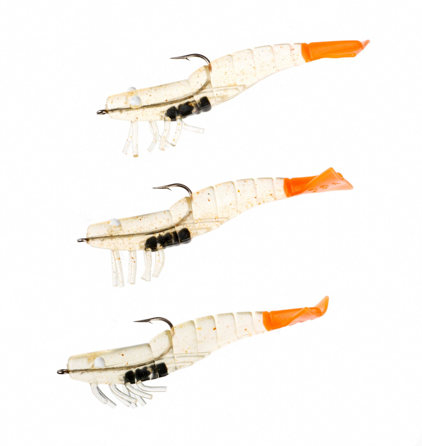 The D.O.A. Fishing Lures 3" Standard Shrimp Rigged Plastic Swimbaits 3-Pack are stuffed with real shrimp to make them irresistible to freshwater and saltwater fish. The baits are each rigged with a sharp hook and feature a realistic shrimp design. 1/4 oz. Hook size: 3/0. Made in USA.
