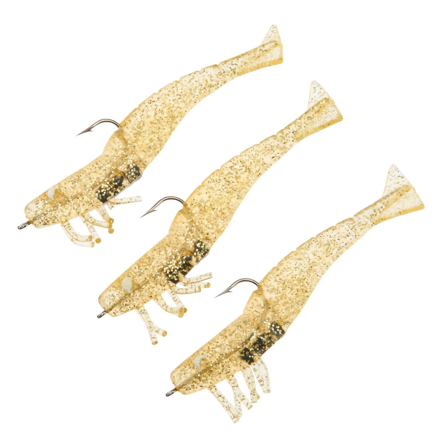 The D.O.A. Fishing Lures 3" Standard Shrimp Rigged Plastic Swimbaits 3-Pack are stuffed with real shrimp to make them irresistible to freshwater and saltwater fish. The baits are each rigged with a sharp hook and feature a realistic shrimp design. 1/4 oz. Hook size: 3/0. Made in USA.