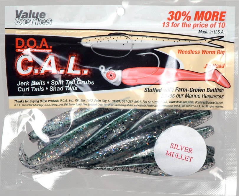 Attract numerous freshwater and saltwater fish with D.O.A. Fishing Lures 4" Jerk Baits 12-Pack. The baits are made of soft plastic material and feature enticing split tails. Weighs 0.2 oz. 4" long.