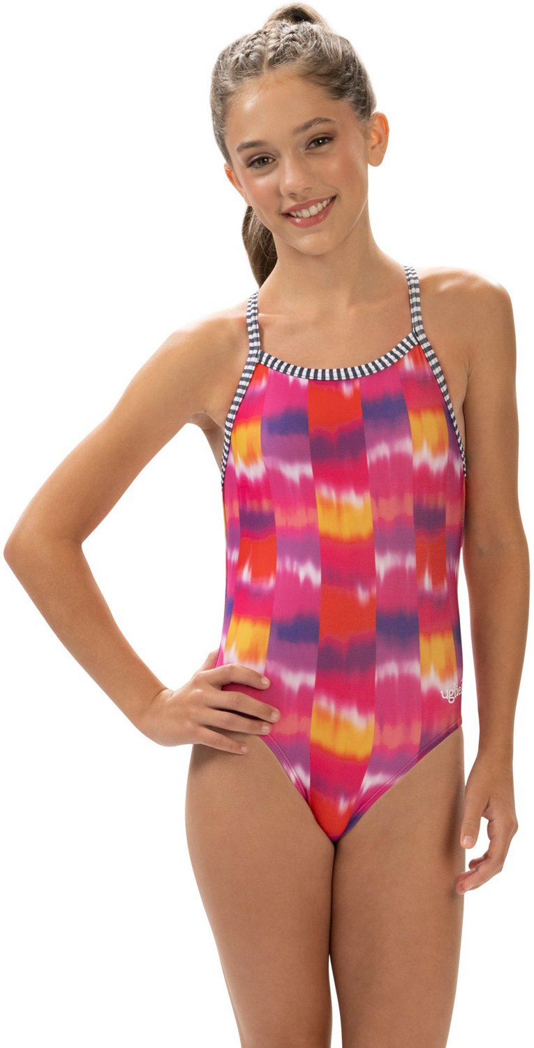 Let your daughter show off her style while swimming in the Dolfin Girls' Uglies Print 1-Piece Swimsuit. This 1-piece swimsuit has a crisscross back and a printed graphic for a stylish look. The modest cut, shape retention and UV protection help ensure it holds its fit all day while blocking the sun's rays.