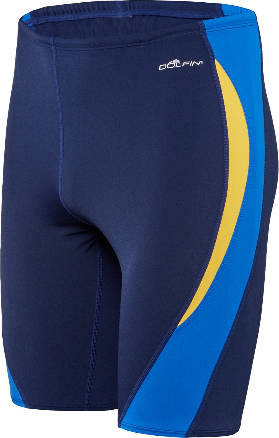 Great for practice or swim meets, the Dolfin Men's Colorblock Jammer is made of 100% polyester with a front lining for comfortable wear as you glide through the water. The colorblock design provides a great look, and the Dolfin graphic at the left hip offers a touch of style.