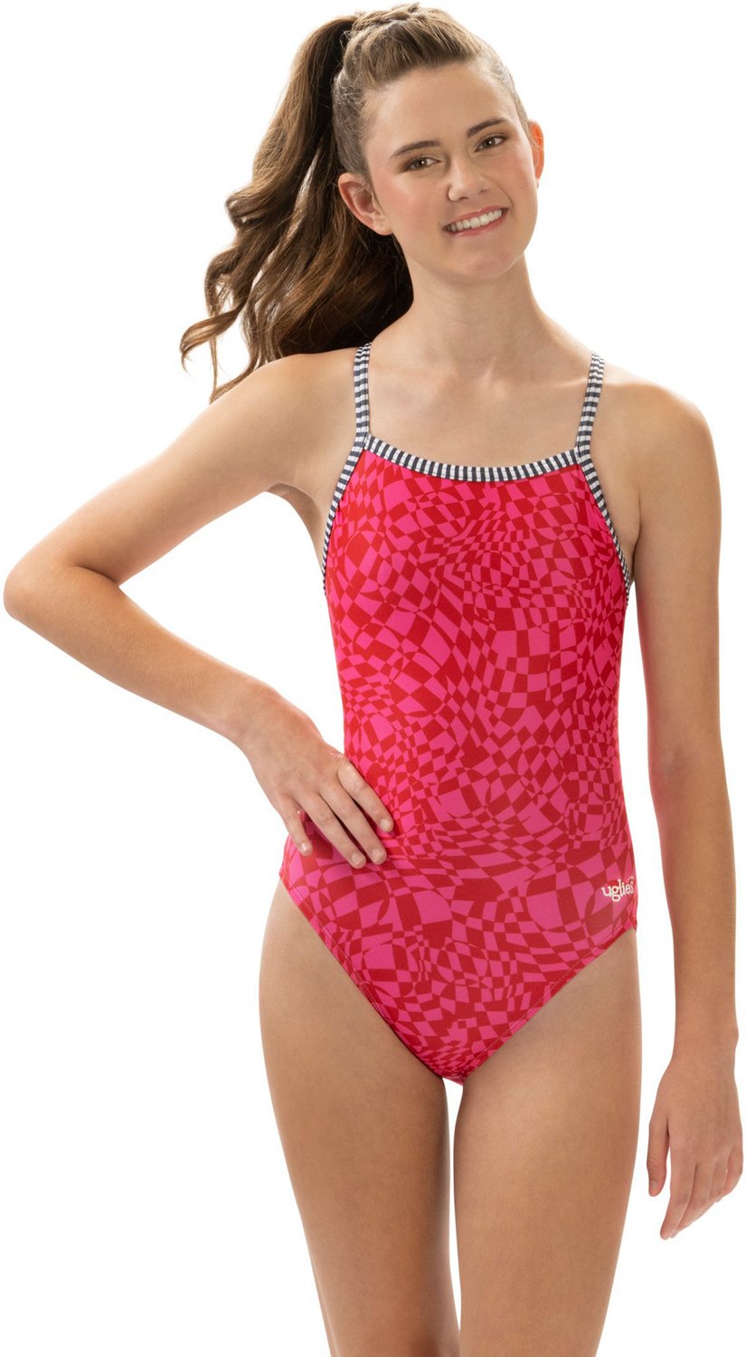 Spend hours in the pool with the Dolfin Women's Uglies V-2 Back 1-Piecce Swimsuit. This chlorine-resistant swimsuit is made with shape retention technology to help keep its tight fit. It is made of a blend 91% polyester and 9% spandex and features a V-back with keyhole and candy stripes on the straps.