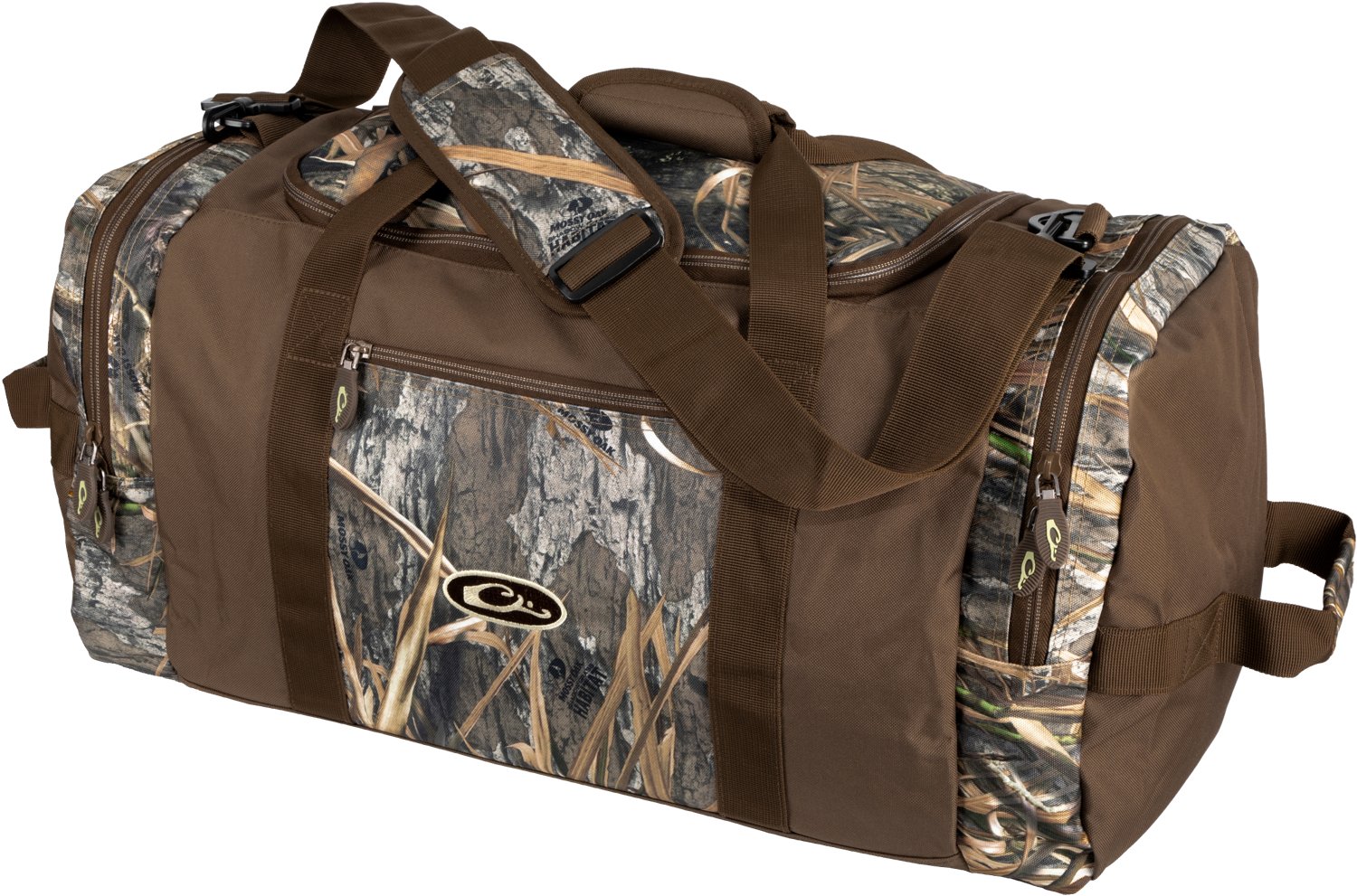 Haul your gear in the Drake Medium Camo Duffel Bag. This duffle bag is made of 600-denier polyester fabric for durability, and it features an adjustable shoulder strap for comfortable carrying. The PE board at the bottom of the bag maintains shape and structure, while the carry handles and hook-and-loop closure enable easy hauling.