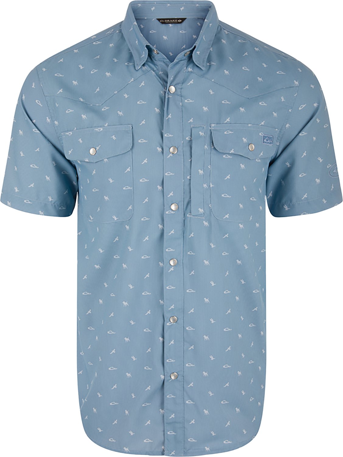 You can stay comfortable, dry and protected from the sun's harmful rays when you wear this Drake Men's Cinco Ranch Western Shirt on your next outdoor excursion. Its polyester-Spandex blend wicks sweat quickly and provides UPF 30 protection, and the combo of its print and faux pearl snap buttons offers stylish looks to complete your ensemble.