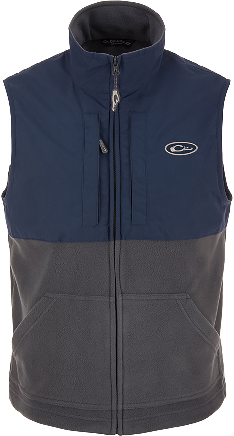 Look your best when you wear the Drake Men's Eqwader Vest. It is made of 100% polyester. The Refuge HS™ with HyperShield™ 2.0 Technology on the upper body is 100% waterproof and windproof, and its 190-gram fleece lower body enhances breathability under waders. The fleece-liner enhances warmth.