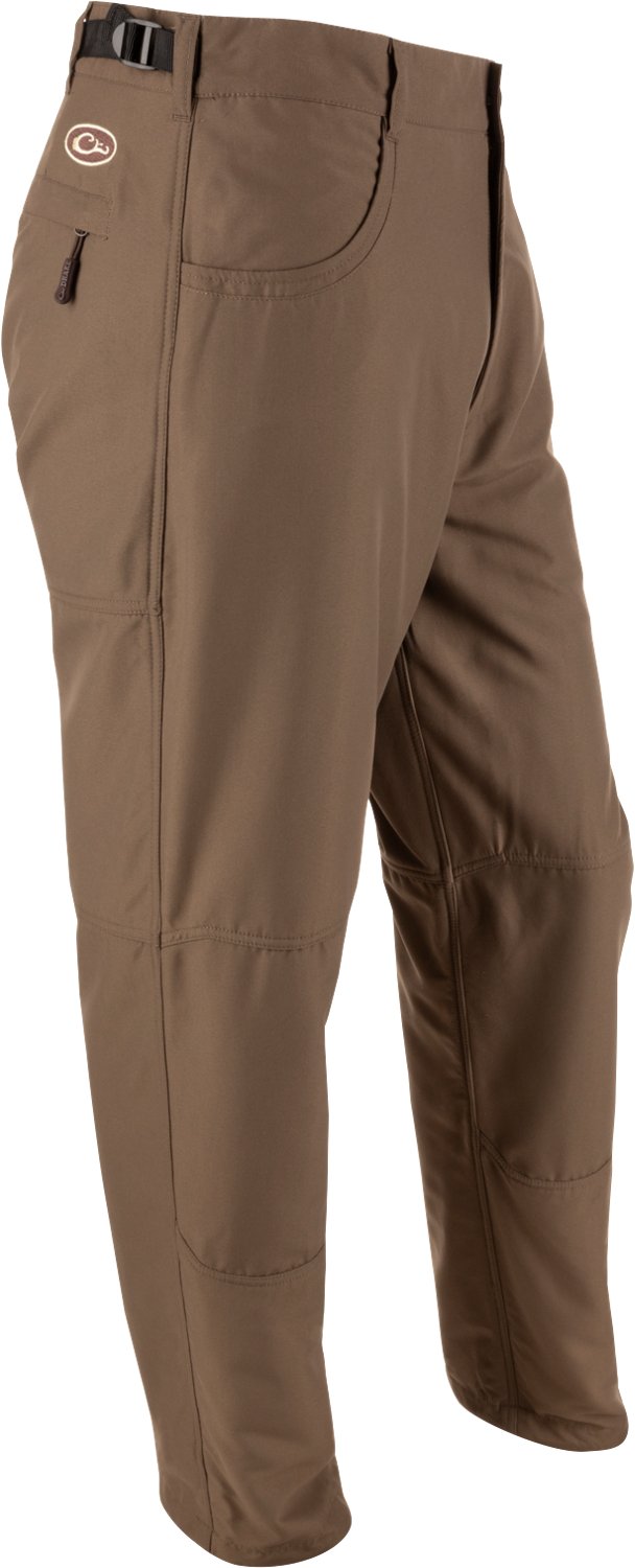 The Drake Men's MST Jean Cut Solid Wader Pant combines comfort and function, perfect for wearing under waders. Made with 100% polyester shell fabric treated with DWR, these pants help shed water while keeping you dry in wet conditions. The 280g micro-fleece lining adds warmth, and features like front slash pockets, a zippered rear pocket, and an adjustable waist provide practicality and a customizable fit. The shock cord ankle adjustment with cord locks, along with the stirrup design, helps keep the pant legs in place, making these pants a great choice for outdoor adventures.