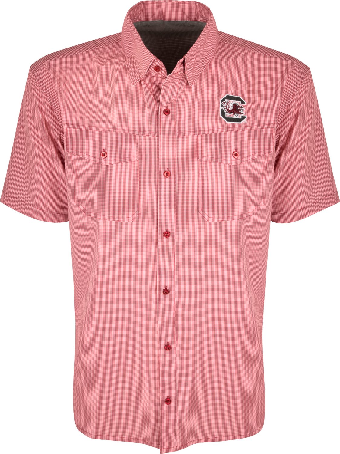 Display your fan pride and stay comfortable when you wear the Drake Men's University of South Carolina Traveler's Short Sleeve Shirt. The Gamecocks-themed design proudly showcases your fandom, and the wrinkle-resistant material keeps you looking crisp and sharp. The polyester and spandex fabric delivers lightweight, breathable wear, while the four-way stretch construction offers freedom of movement and comfort on the go.