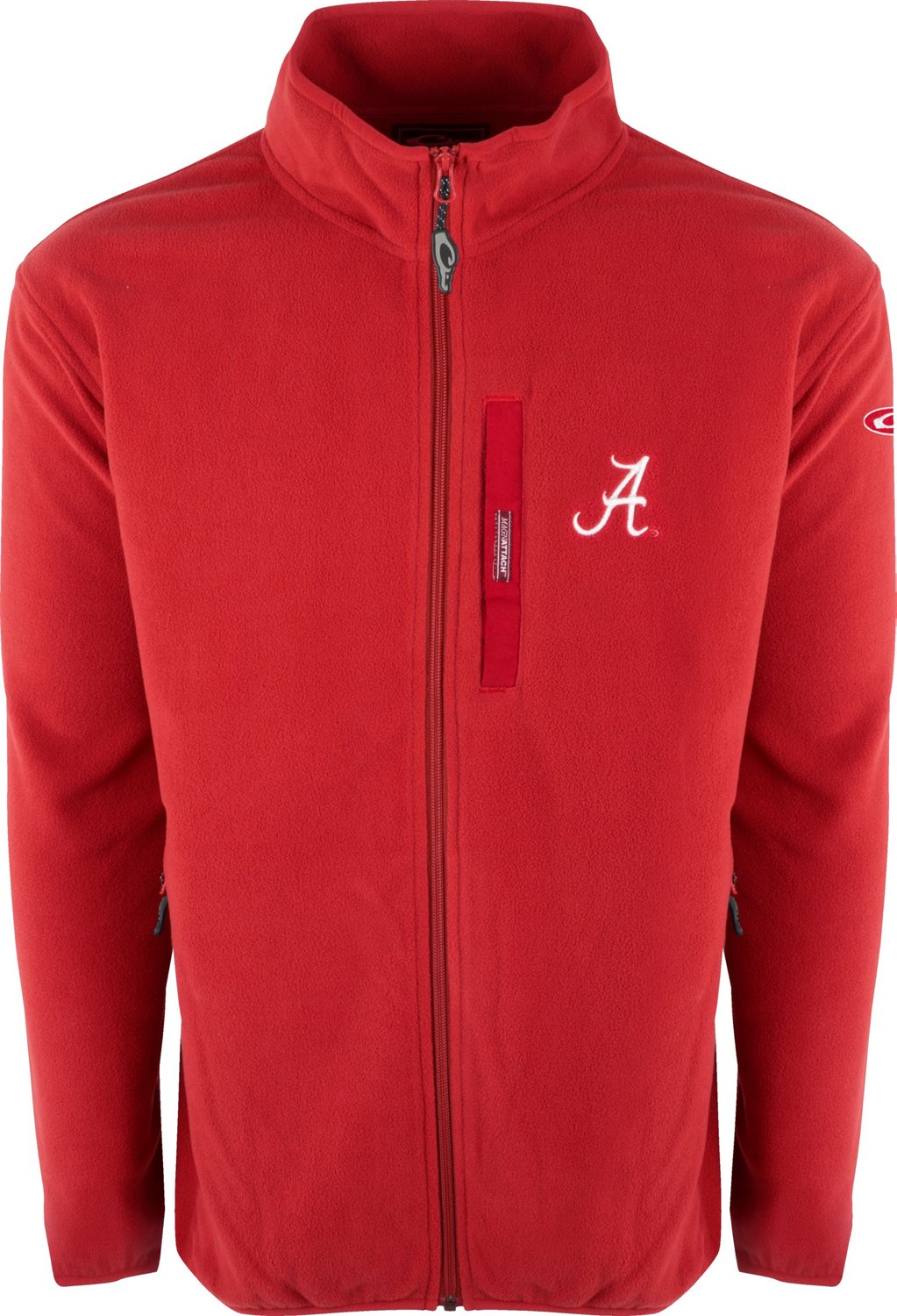 Show off your team pride and stay cozy in the Drake Waterfowl Men's University of Alabama Camp Fleece Full Zip Sweatshirt. The 100% polyester micro-fleece construction is ultrasoft and supplies warmth. The moisture wicking technology keeps you dry and comfortable, while the embroidered Crimson Tide logo graphic displays your fandom.
