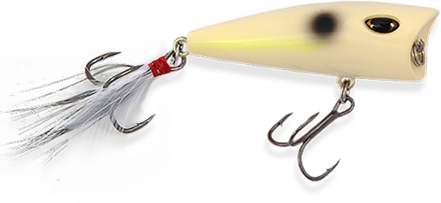 Rank up at your next bass fishing competition with the Duckett Fishing BD 60 1/2 oz. - 2-1/4 in Topwater Popper. This popper grabs the attention of bass, splashing and chugging to entice it to attack. The 3-D eyes provide a realistic look, and the feathered rear-treble hook keeps the bass on the line. This popper is designed to create substantial disturbance on the surface of the water and is suited for competitive use.