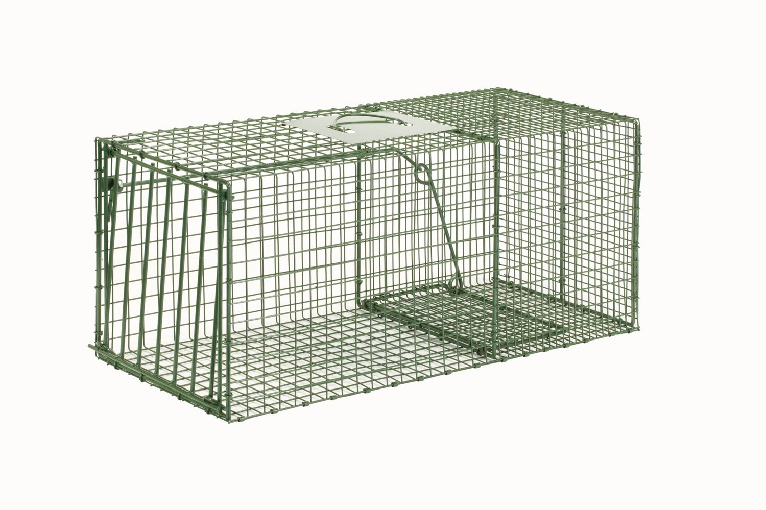 Trap raccoons with the Duke Traps HD Large Cage Trap. The heavy rod reinforced frame offers durability, while the steel bar reinforced gravity drop door provides security. The narrow cage mesh protects bait, and the rollover design allows for safe and easy release.