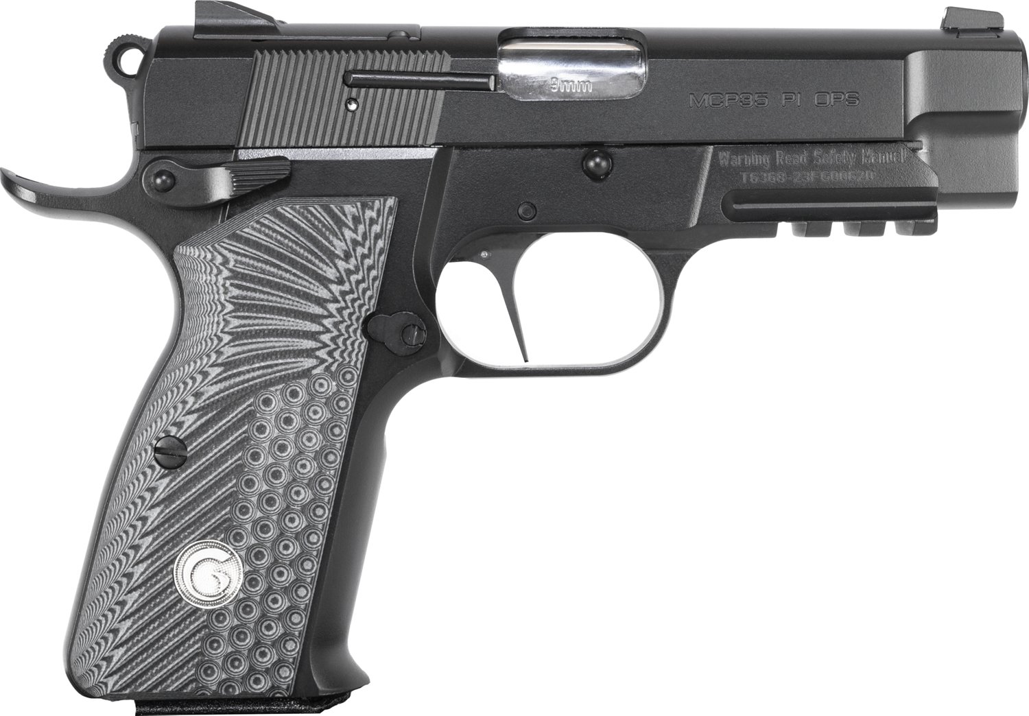 The EAA Corp Girsan MCP35 PI OPS 9mm Pistol is single action and has a 15+1 round capacity. It's built with a steel barrel, serrated steel optic ready slide and steel frame. A black G10 grip, ambidextrous safety and 3-dot sight complete the design.