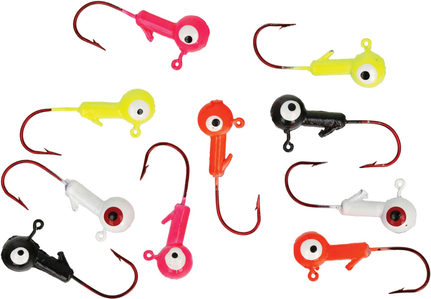 Fill your tackle box with the Eagle Claw Assorted Ball Jigheads 10-Pack. These jigheads feature unique paint schemes and eyes to create a lifelike appearance, while the molded bait keepers and Eagle Claw hooks help maintain bait security. The high carbon steel ensures lasting use.