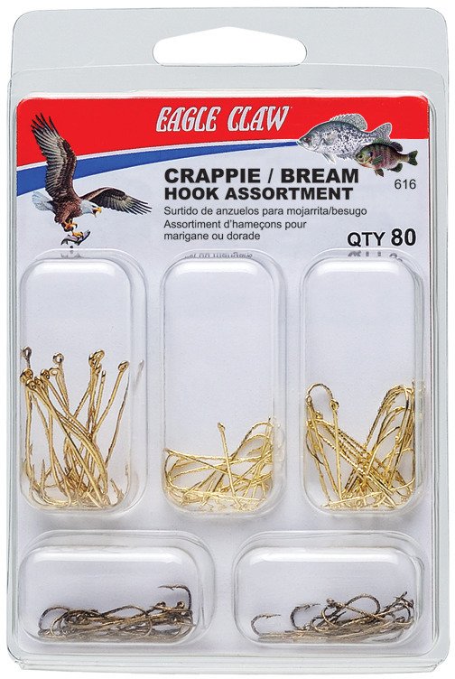 Great for freshwater fishing, the Eagle Claw Assorted Crappie/Bream Hooks 80-Pack feature light wire Aberdeen hooks with bronze and gold finishes ranging in size from 1/0 - 6. Single style. Made in USA.