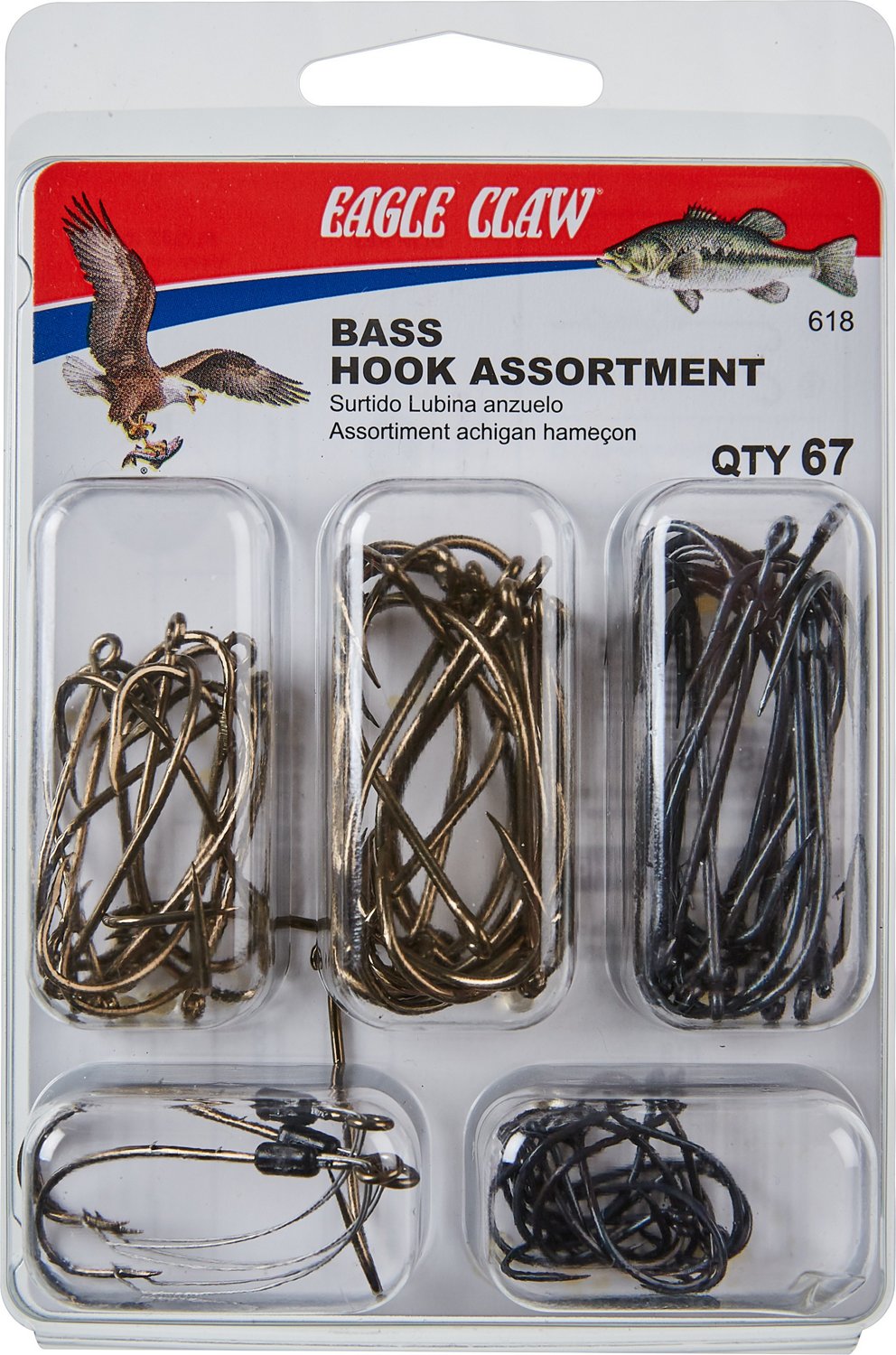 The Eagle Claw Bass Hook Assortment 67-Pack includes kahle, weedless, worm and plain shank hooks designed for catching bass, so you'll be prepared for the next big bite. These freshwater hooks come in a variety of finishes, and the sizes range from 1 to 3/0.