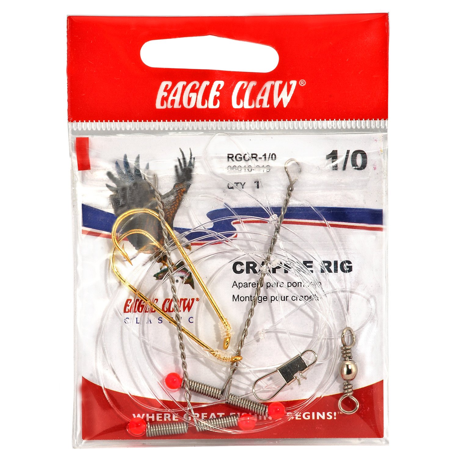 Fill your tackle box with the Eagle Claw Crappie Rig. The rig boasts a barrel swivel design with a dual-lock snap and 2 wire spreader arms. It has a 36-inch clear monofilament line and 2 gold Aberdeen hooks.
