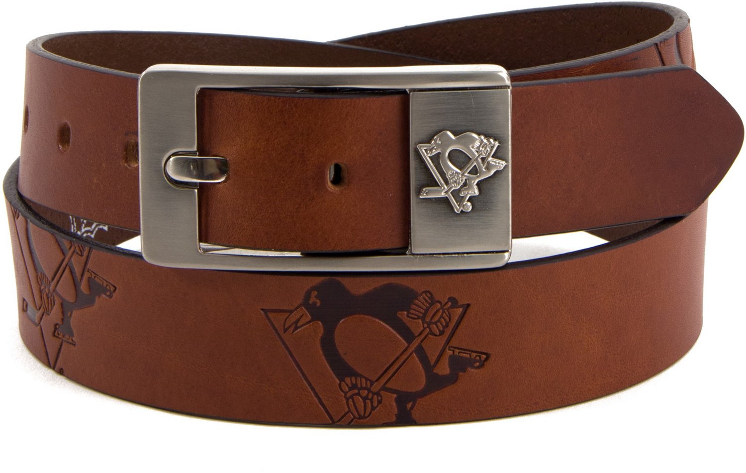 Function meets style with the Eagle Wings Men's Pittsburgh Penguins Brandish Belt. The leather construction offers durability, while the polished buckle ensures a snug fit. The team logo shows off your Penguins pride.