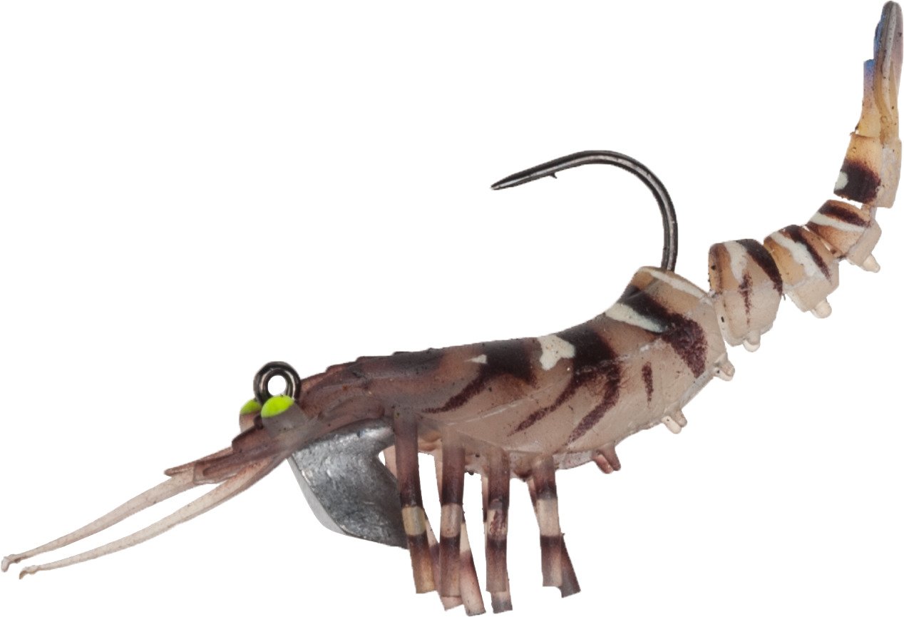 Shrimp shaped with glowing eyes and a tail that provides a natural swimming action for attracting fish