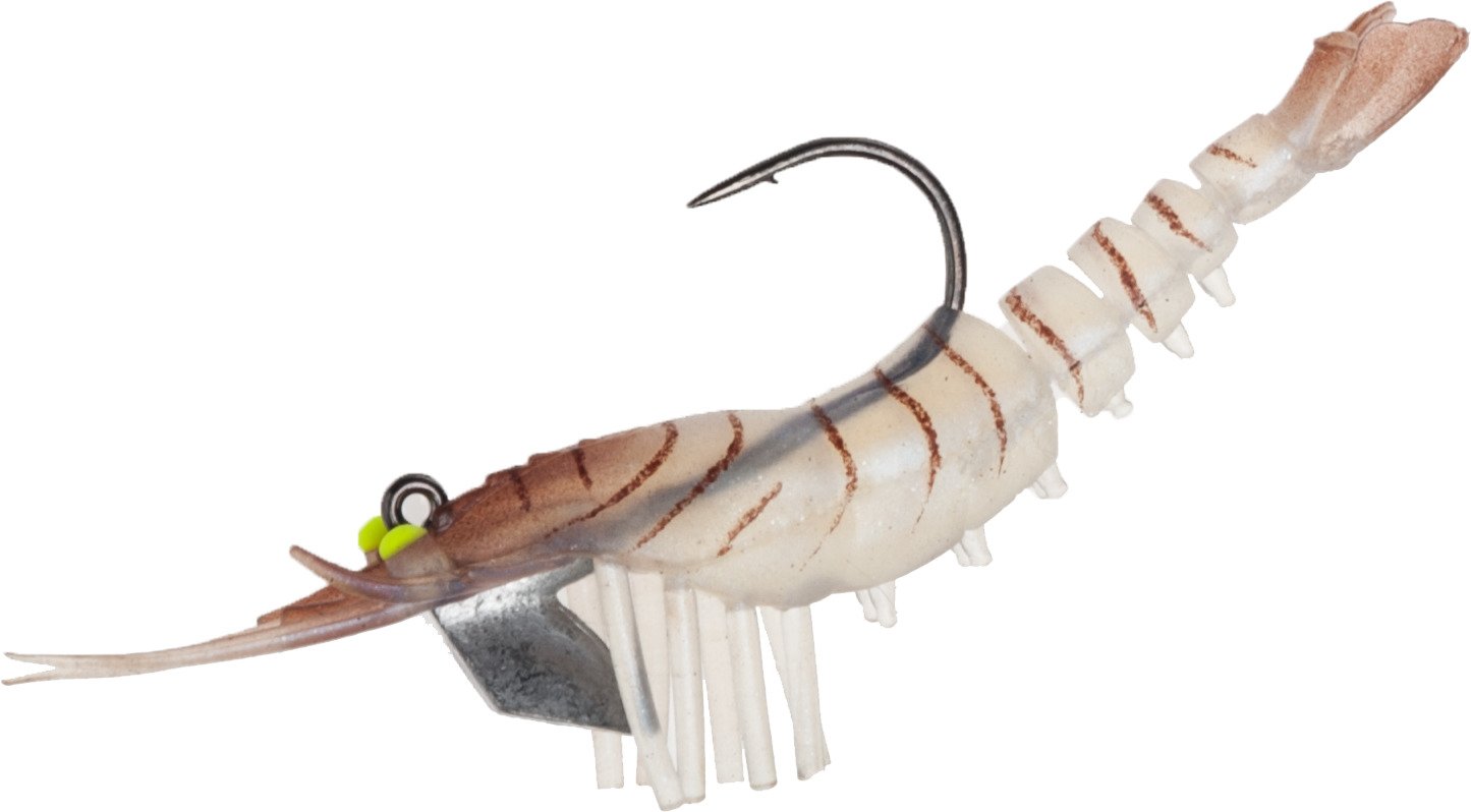 Shrimp shaped with glowing eyes and a tail that provides a natural swimming action for attracting fish
