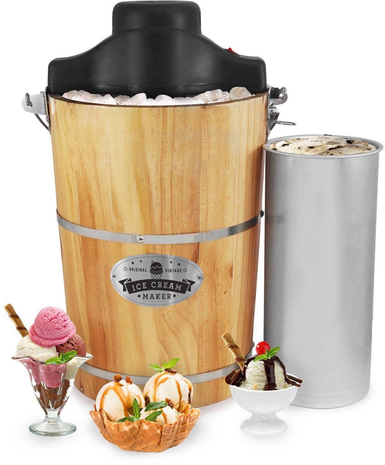 Includes motor, wooden bucket with handle, stabilizing ring, freezing canister with indent, canister lid and cap, stirrer, dasher paddle and die-cast hand crank