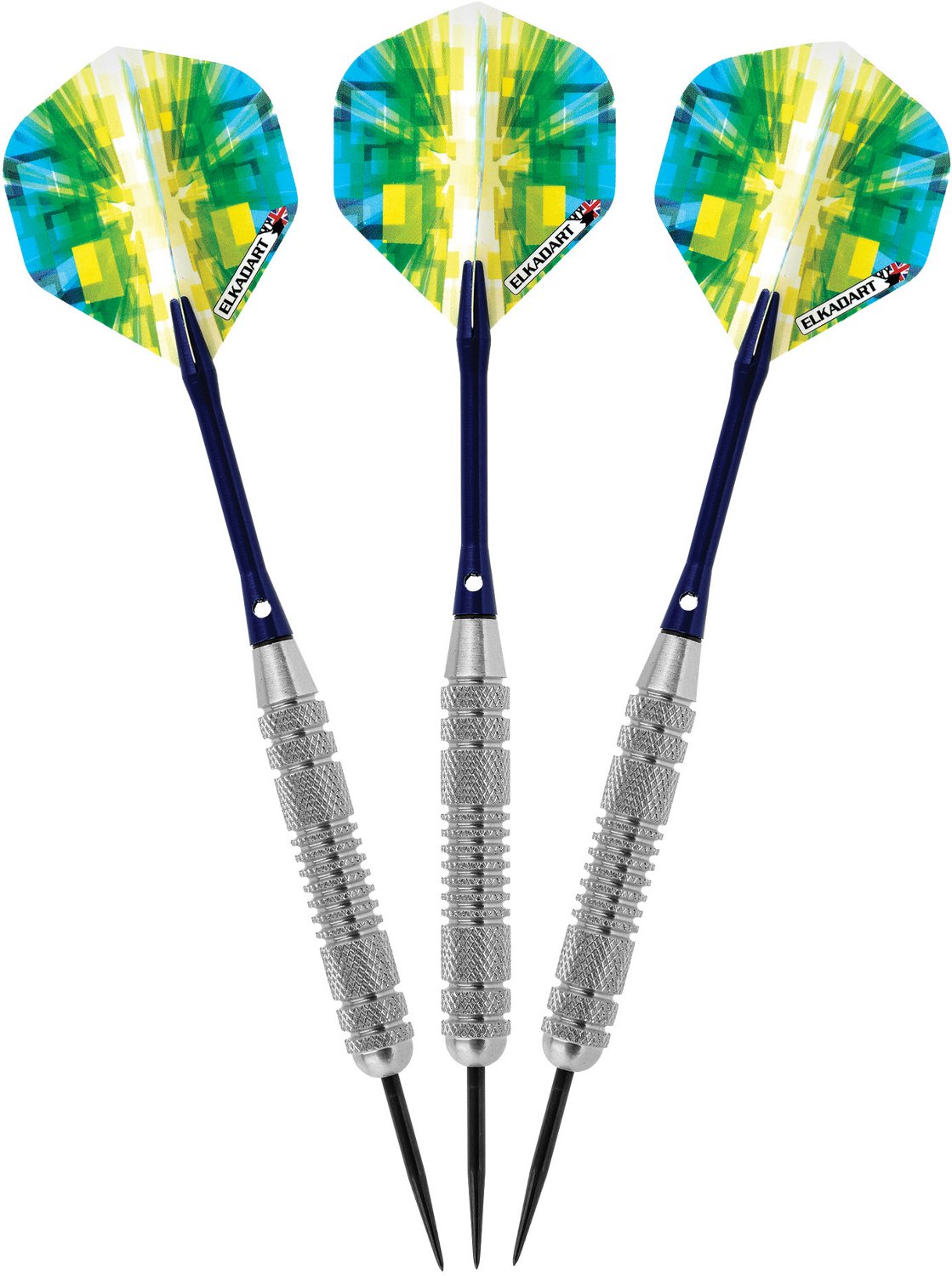 With the Elkadart Prism Ringed 23 g Steel-Tip Darts 3-Pack, you'll be headed straight for the bull's-eye. That's because the ringed barrels afford extra grip, so you can throw with precision. A unique graphic on the flights makes these darts an excellent addition to your collection. Steel tips. 23 grams.