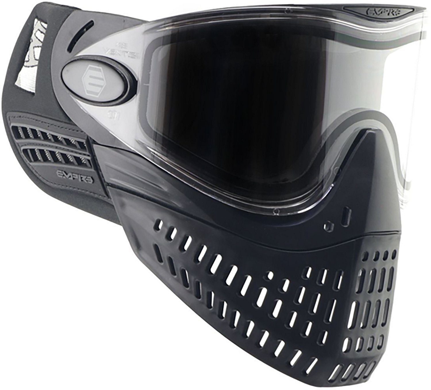Protect your face with the Empire E-Vent Paintball Mask. Its hypo-allergenic Spectra ProFlex face foam provides a comfortable wear. The solid face skirt offers excellent breathability and voice projection, and its E-Vent thermo-foam ear pieces allow you to hear everything around you. The thermal, anti-fog, dual-pane clear lens ensures a 270-degree view and zero optical distortion.