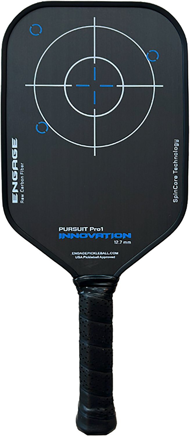 Designed with a Raw Carbon Fiber skin and an inner application layer, the Engage Sporting Pursuit Pro1 Innovation Pickleball Paddle is your go-to paddle for maximum spin. The paddle is designed with a Power Flex Polymer Core, which helps offer dependable energy return, and ProFlex weighting to keep you in control.