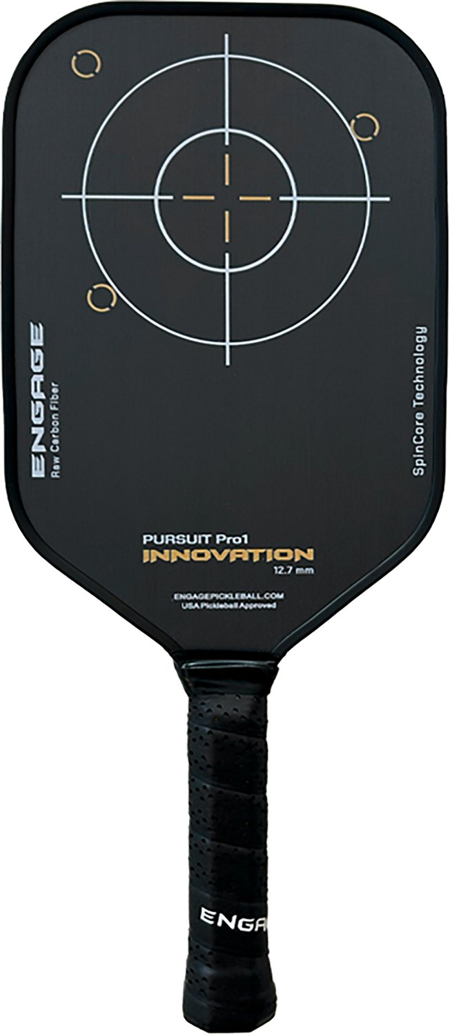 Designed with a Raw Carbon Fiber skin and an inner application layer, the Engage Sporting Pursuit Pro1 Innovation Pickleball Paddle is your go-to paddle for maximum spin. The paddle is designed with a Power Flex Polymer Core, which helps offer dependable energy return, and ProFlex weighting to keep you in control.