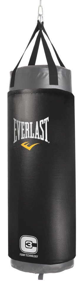 The Everlast® Elite 100 lb. C3 Foam Heavy Bag features C3 Foam Technology for cushioning and force dispersion. The bag has a resilient design, a polycanvas sleeve and a NevaTear shell for durability. The bag is stuffed with natural and synthetic fibers that are blended with sifted sand to create a homogeneous feel. Double-end attachment. Black.