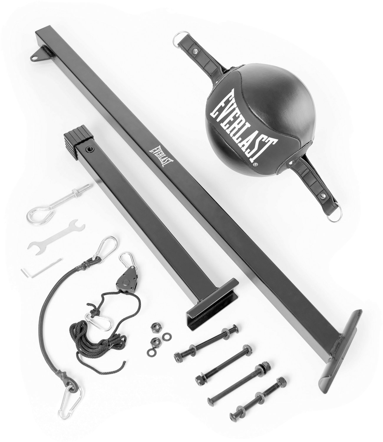 Reach your training goals with the Everlast Heavy Bag Stand Double End Attachment Kit. The double end bag training provides additional hand-eye coordination and stamina, and the steel and PVC construction ensures long-lasting dependability. The kit includes everything you need for full body training including an elite double end bag, dual arm mounting system, side flexible, top mount bungee cord and mount tensioning pulley system for optimal performance.