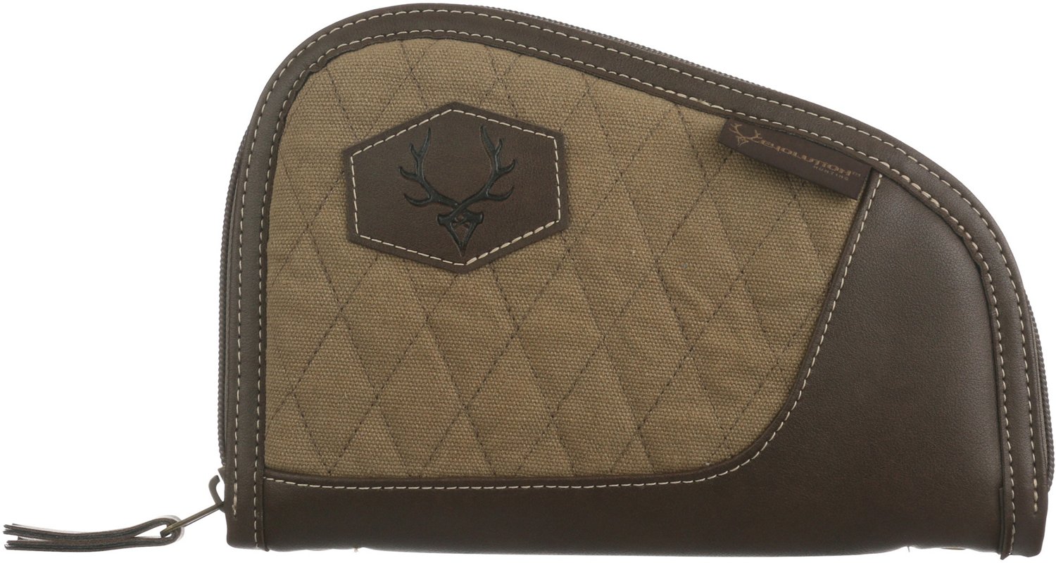 A classic look combines with the practical with the Evolution Hunting President Series 8 in Pistol Case. This durable pistol case is made of 12-ounce quilted cotton canvas and has a dual foam interior to protect your pistol from damage. The classic look of the canvas is enhanced by the antique brass zipper, the leatherette trims and accents and the suede lining.
