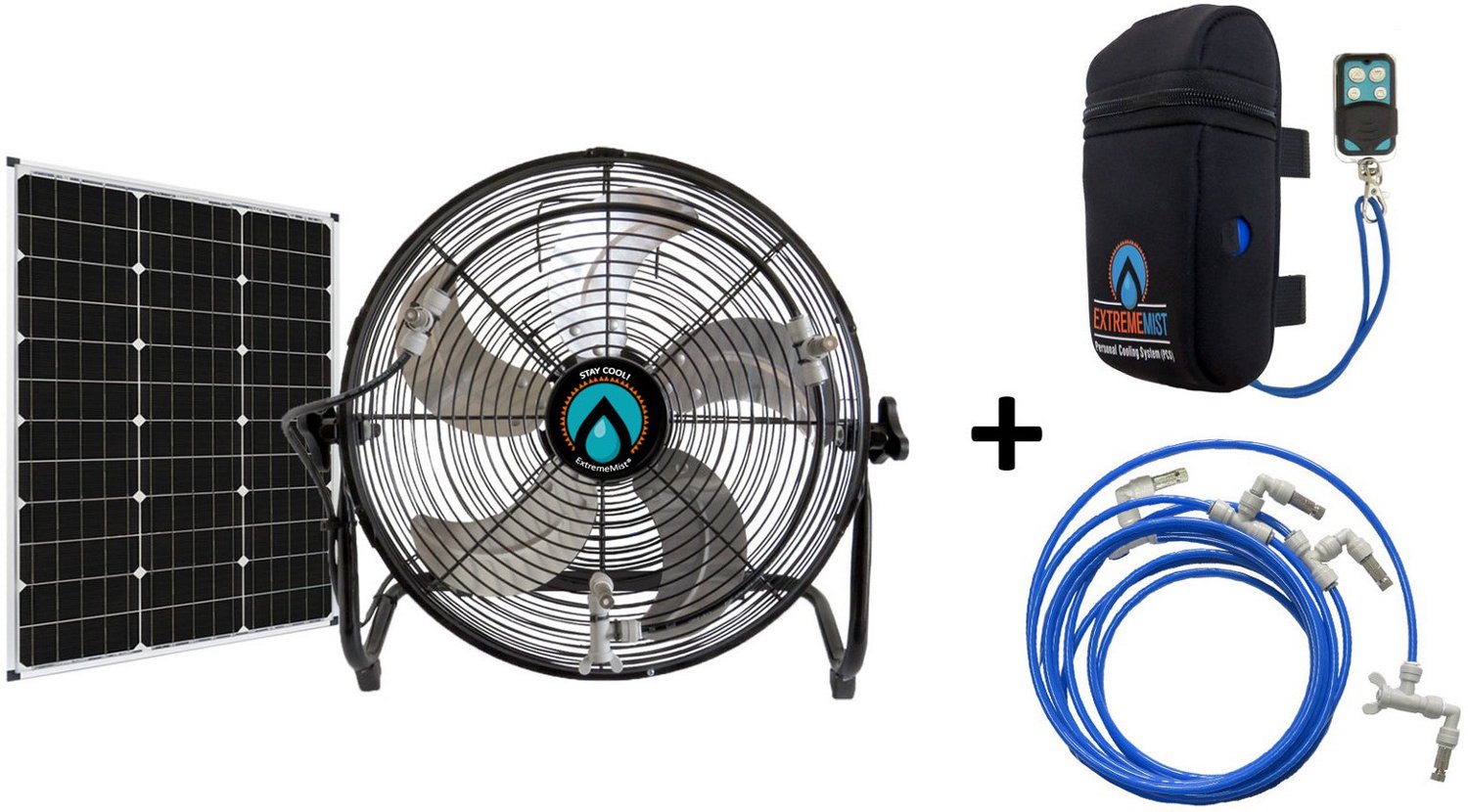 Keep your awning, porch or patio area cool with the ExtremeMIST Portable Misting Fan. This outdoor cooling system combines a 5-blade fan with 3 misting nozzles, spreading a refreshing mist of cool water that cools the air by up to 30 degrees. The system connects to any size water source, while the tilting head lets you angle the breeze where you need it.