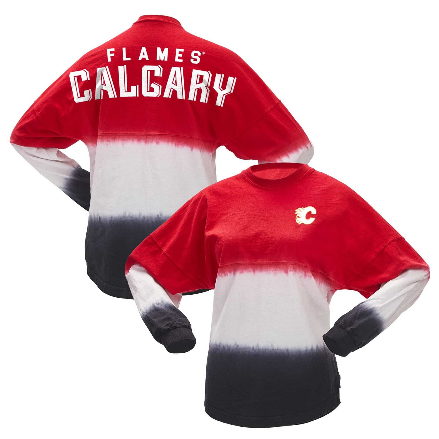 The Women's Fanatics Red/Black Calgary Flames Ombre Long Sleeve T-Shirt is the perfect way to show your support for the Calgary Flames With its low-puff screen-print graphics and crew-neck collar this shirt is both stylish and comfortable The dropped shoulders ribbed collar and sleeve cuffs add a touch of sophistication while the rounded hem ensures a flattering fit Made from soft cotton this shirt is perfect for any occasion whether you're cheering on the Flames at the game or relaxing at home