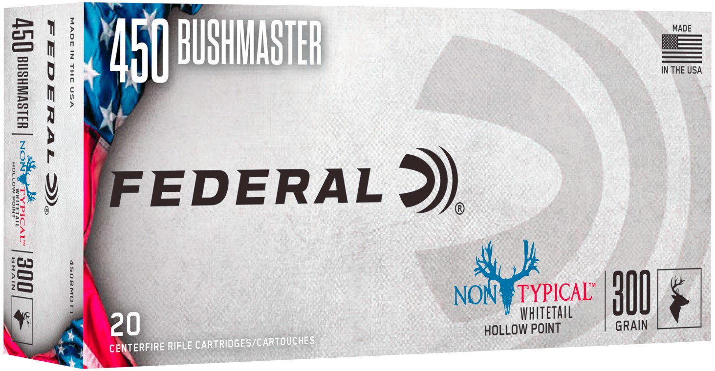 The Federal Premium Non-Typical .450 Bushmaster 300-Grain Centerfire Rifle Ammunition is loaded for big game hunting. This ammunition features consistent federal primers and jacketed hollow points. 20-round box. 1,900 fps muzzle velocity.