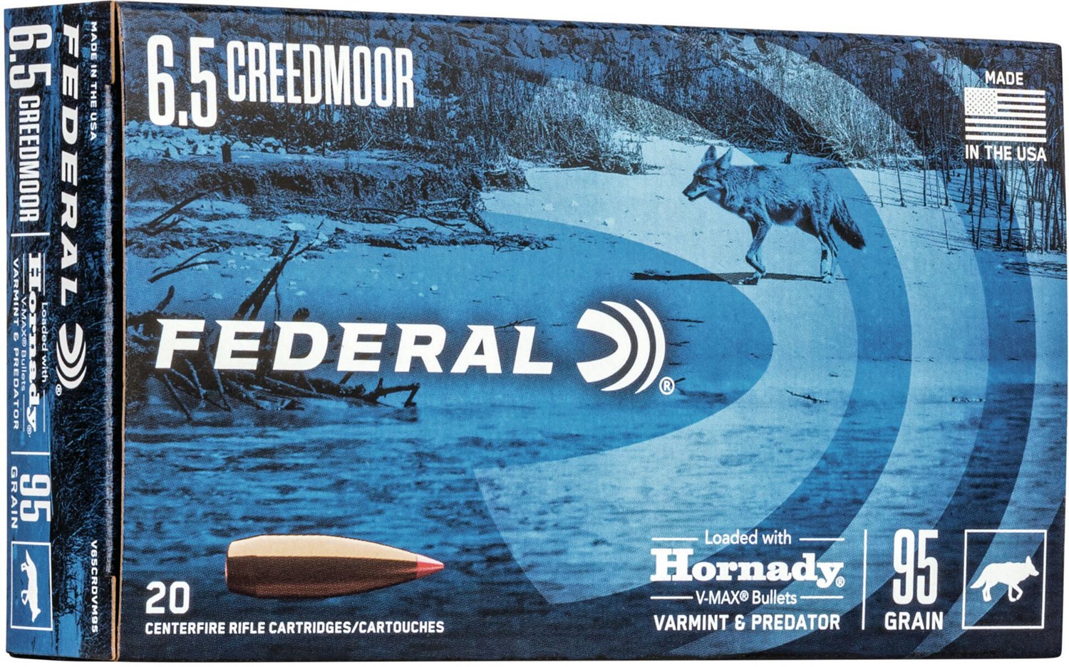 Crafted in the USA, the Federal Premium Varmint and Predator 6.5 Creedmoor 95-Grain Centerfire Rifle Ammunition features Hornady® V-Max® bullets with durable brass primers and a 3,300 fps muzzle velocity. 20-round box.