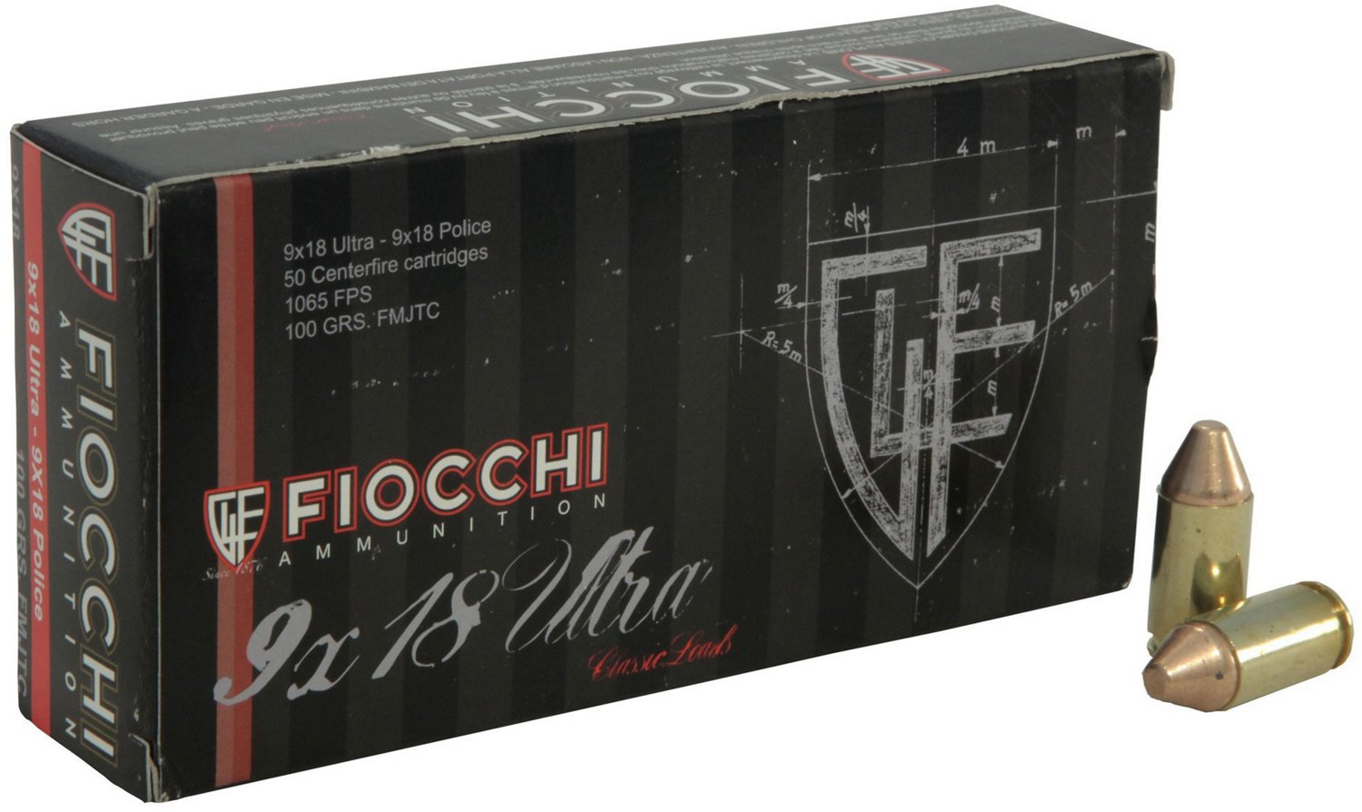 The Fiocchi Specialty 9mm x 18mm Ultra Police 100-Grain Full Metal Jacket Centerfire Handgun Ammunition features FMJ bullets with brass cases. Classic centerfire primers. 50-round box.