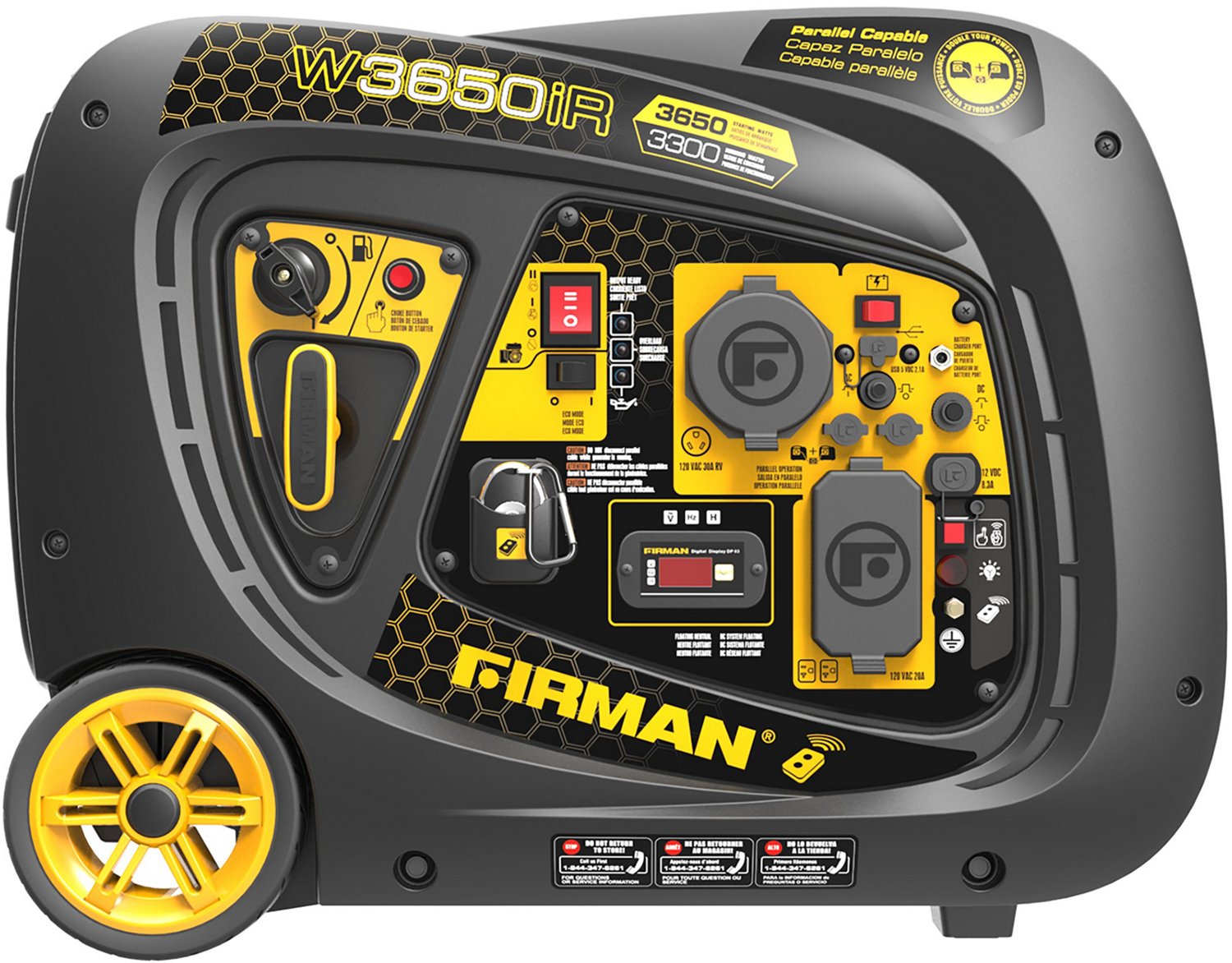 Power your adventures with the Firman 3650W Remote Start Inverter Generator. The 193cc engine with a Phoenix Fat Head Block offers cool, efficient powering and supplies 3650 watt power for home, camping or tailgating applications. The Whisper Series muffler encourages quiet use to meet National Park standards, while the built in wheel kit and handle encourages easy portability.
