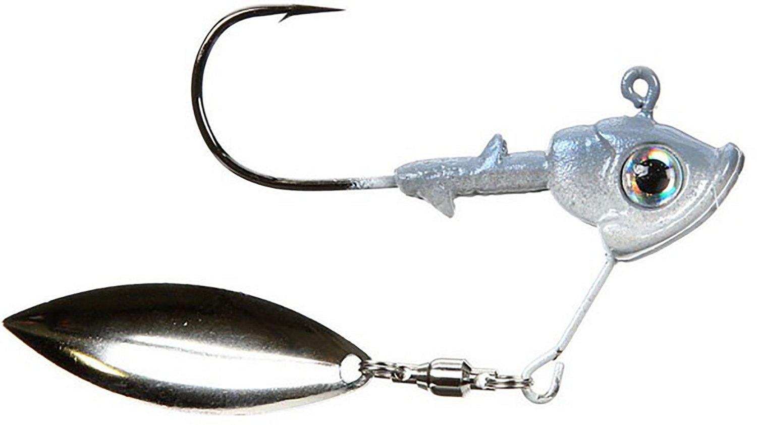 Lure in your next trophy with the Fish Head Stand-Up Fish Head Spin Jig. This jig has a weight-forward design that lets the bait swim through water in a head-down motion, while stop-and-go action allows the bait to stand up on the bottom in order to mimic baitfish feeding movements. The blade creates a lifelike appearance.
