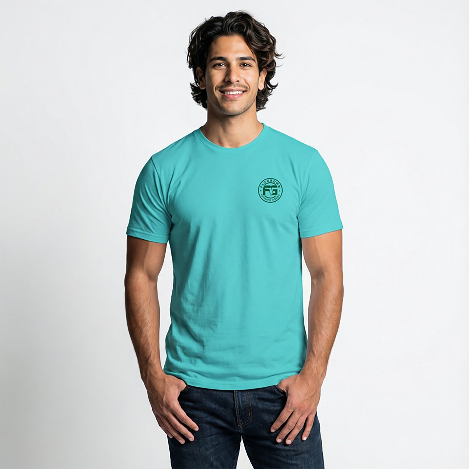 Screen-printed faded Florida flag with "FLOGROWN" and Florida map with golf hole with flag and the word "There's Nothing Better in the Hole State" on back makes shirt stand out