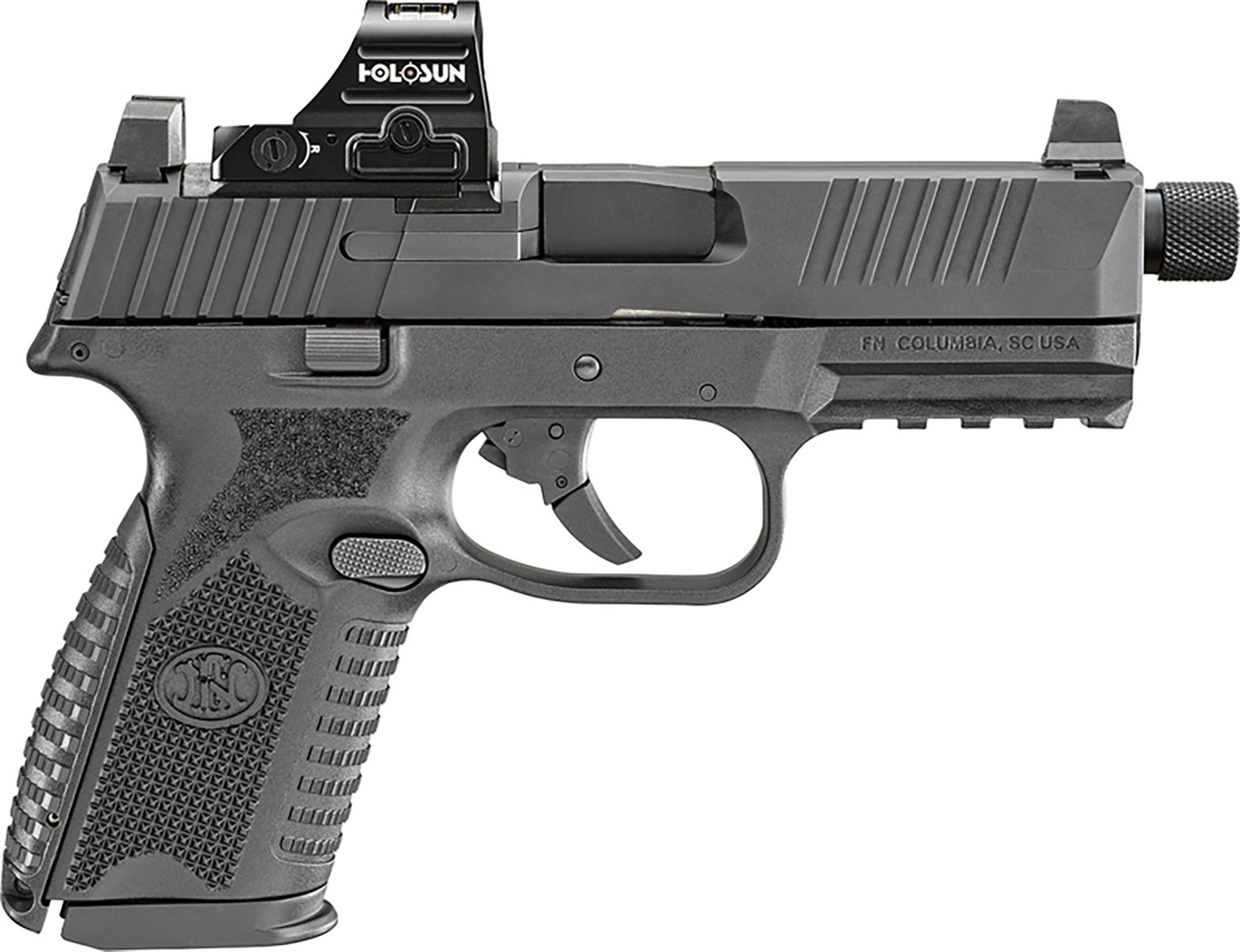 Arm yourself with the FN 509 Midsize Tactical 9mm Semiautomatic Pistol. It is semiautomatic with a 10-round capacity. The threaded barrel with a black finish is 4.5-inches long, and it is equipped with a black polymer grip. The Holosun 407C sights finish off the design.