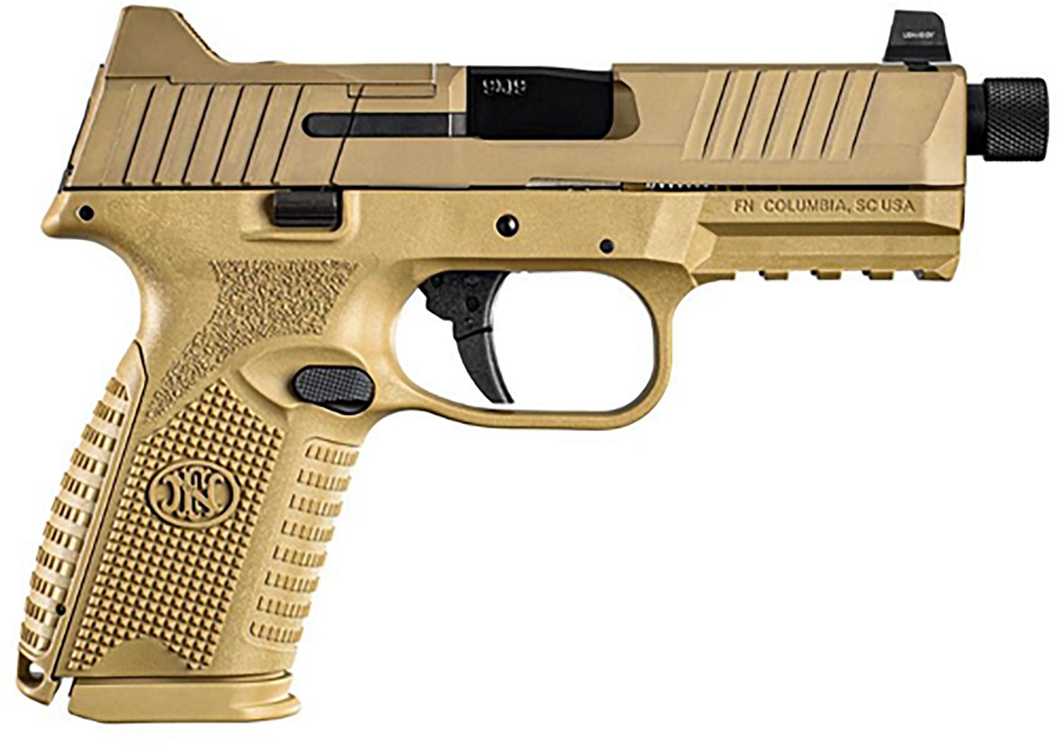 Step into the field with the FN FN 509 Midsize Tactical 9mm Semiautomatic Polymer Frame Pistol. The 4.5-inch barrel is threaded with a 1/2x28 pattern, and the FDE polymer frame has an applied flat dark earth finish.