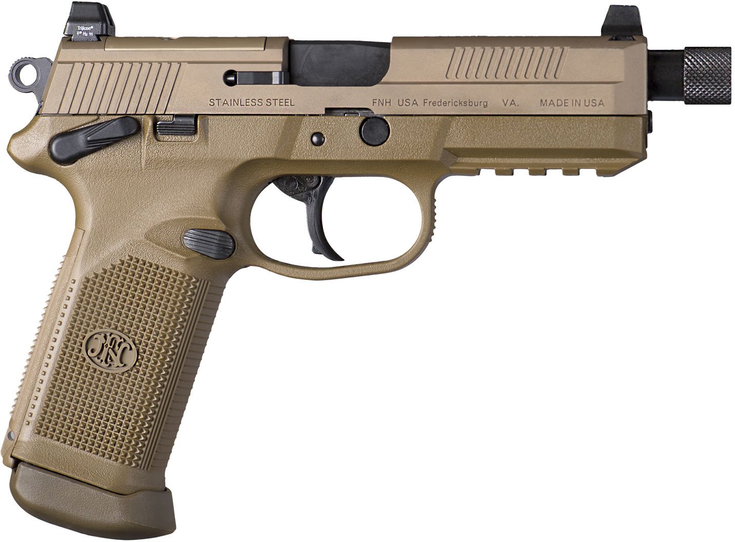 Boasting a 10+1-round capacity, the FN FNX-45 Threaded FDE NS 45 ACP Full-Sized 10-Round Pistol presents with a 5.3-inch, stainless-steel threaded barrel. On its checkered polymer frame, it comes furnished with 2 interchangeable backstrap grips with lanyard eyelets, a manual safety and a decocker. Includes fixed 3-dot night sights.