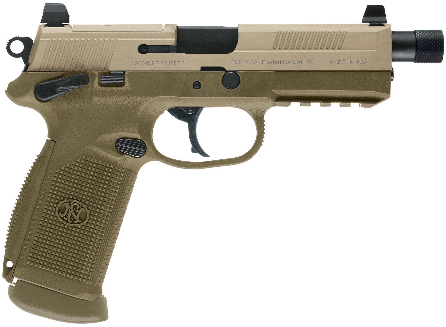 The FN FNX-45 Threaded FDE NS 45 ACP Full-Sized 15-Round Pistol features a cold hammer-forged stainless-steel barrel with a threaded muzzle and a stainless-steel slide with high-profile combat night sights. The 2 included mounting bases accept multiple styles of optional red-dot electronic sights (sold separately). Checkered polymer frame.