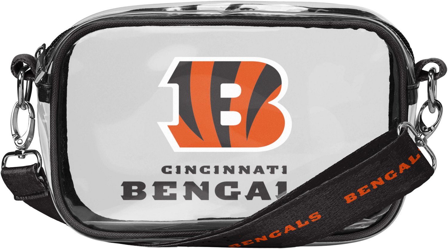 Bring all you need to watch the Bengals get a victory with the FOCO Cincinnati Bengals Clear Camera Bag. This bag is clear and features a team design that helps prove your loyalty, and the strap makes it easy to throw over your shoulder.